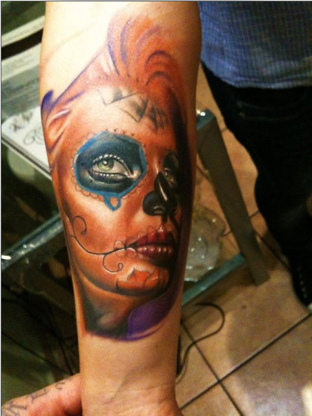 Die Beschreibung von Lotus trifft es schon ganz gut. Google mal nach Dia De Los Muertos oder z. B. nach Nikko Hurtado. Ein genialer Tätowierer, der diesen Stil prägte.