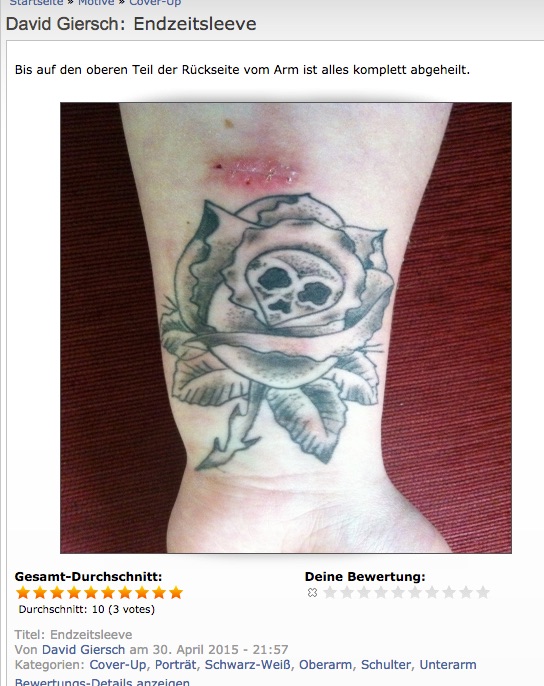 Hi, TB verwirrt mich manchmal etwas. Es passiert oft, dass ich irgendwelche Tattoos, zu denen ich teilweise auch schon was geschrieben habe, nicht wieder finde ... bislang bin ich immer davon ausgegangen, dass die User das wieder gelöscht haben. Heute nun dies: Ich habe heute ein Tattoo bewertet und was dazu geschrieben, kurze Zeit später war es weg, bei meinen "letzten Aktivitäten" taucht auch nicht auf, dass ich da was geschrieben hätte, etc. Nun ja. Nun finde ich das gleiche Bild wieder - unter einem anderen Titel, von einem anderen User hochgeladen und, angesichts der Qualität, mit astronomisch guten Bewertungen. Offensichtlich sehen andere User da etwas anderes als ich - sie schreiben auch was von Sleeve, dabei handelt es sich um ein Unterarmtattoo. Also nur ma ne Frage: Liegts an meinem Browser? Hab ich zuviel oder zuwenig Kaffee getrunken? Screenshot liegt bei, sagt mir mal, was ihr da seht :)