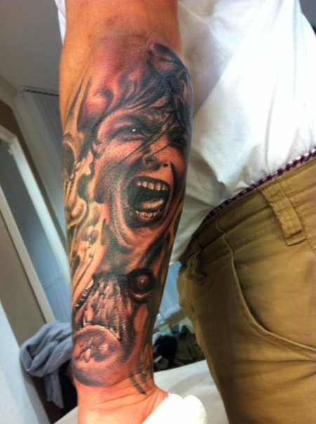 das Frauen gesicht kommt aus dem film psycho und ist die einzige auflage an dem arm bis jetzt der rest wurde freihand angezeichnet ca. 2 std mit pausen und vorbereitung kosten 200 euro Ges ...