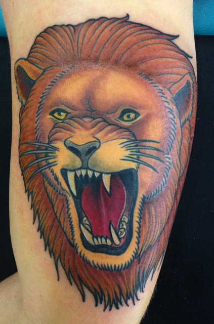 Löwe ist das Sternzeichen von meiner Tochter, Hintergrundfarbe ist auch die Lieblingsfarbe meiner Tochter. Dauer: 11 Stunden. Schmerzen: na ja, akzeptabel. Das Foto ist unmittelbar nach dem letzten Stechen entstanden! ...gestochen von Markus ...