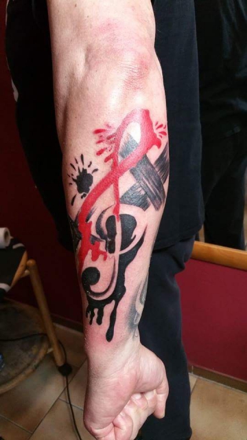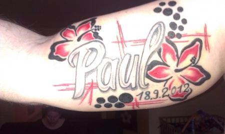 Der Name meines Sohnes...so wie es jetzt ist hat es insgesamt 2std gedauert und hat 220€ gekostet... Schmerzen waren auszuhalten....werde den arm noch weiter machen in diesem Stil. "trash polka" heißt der Stil...finde ihn einfach nur Hammer..... ...