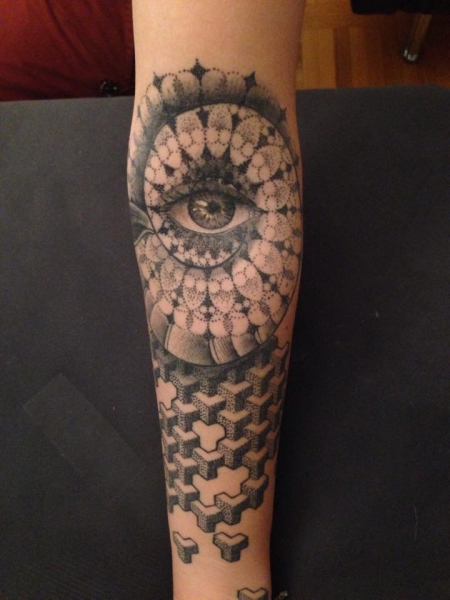 Dotwork unterarm mit 3D elementen, eher realistisches Auge und grafisches mandala in einer muschel.. anlehnung an die geometry in der natur.. ca. 5h, 2 sitzungen. abgeheilt. Gesamt-Durchschni ...