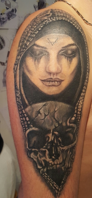 Mein engelchelchen, mit Cover Up . nach 3 Std war es sehr schmerzhaft. 2 mal 5 Std.Gesamtzeit mit pausen. Das untere Bild ist ein Cover es befand sich vorher ein Teufel mit roten Flammen etc. Drunter. TattowiereR stich ...
