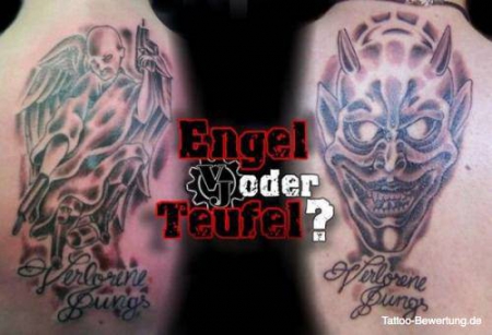 Find ich jetzt nicht gelungen, der Teufel hat ein abgebrochenes Horn und auch nen abgebrochenen Zahn, die Schrift find ich richtig schlecht. Dieser schießwütige Engel hat nen Eierkopf! Nää, kann mich nicht begeistern. 2 P.