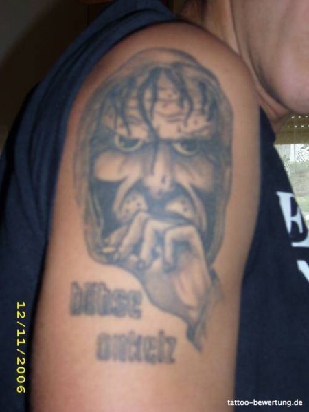 Dem Onkelz-Tattoo muss ich leider einen Punkt geben. Ich muss allerdings einräumen, dass ich kein Experte bin, da ich noch nie eine Onkelz-CD gehört habe. Ich weiß nur, dass die zumindest in ihrer Anfangszeit Abgrenzungsprobleme mit der rechten Szene hatten und dass "Kevin" bei den weiblichen Onkelz-Fans sehr beliebt ist. ("Der ist soooo süüüüß"). Die Musik habe ich nur einmal gehört. Ich hatte einmal einen Arbeitskollegen zu Hause abgeholt, und aus dem Zimmer seiner 16jährigen Tochter erschallte ein nervtötendes Gewummer und ein "Sänger" grölte unverständliche Parolen dazu. Auf meine erschrockene Frage, was das denn für Musik sei, antwortete der Kollege: "ach meine Tochter, die hörst im Moment immer die Böhsen Onkelz." Naja, egal, das blasse Tattoo oben ist auf jeden Fall nicht berauschend. Was hat dieses Gesicht für Punkte unter der Nase? Sind das Schnurhaare wie bei einer Katze?