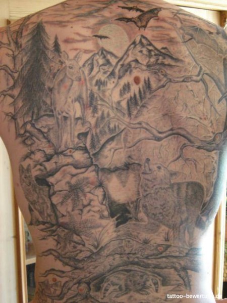 Skizzenmäßig!? Bei einer Skizze sollten aber wenigstens die Proportionen und die Perspektive stimmen, ne! Ohje ... und auch noch so groß! Die Fledermäuse sehen aus wie Flugsaurierschweine, das Reh auch irgendwas Dinomässiges (zumindest der Buckel) und der Wolf