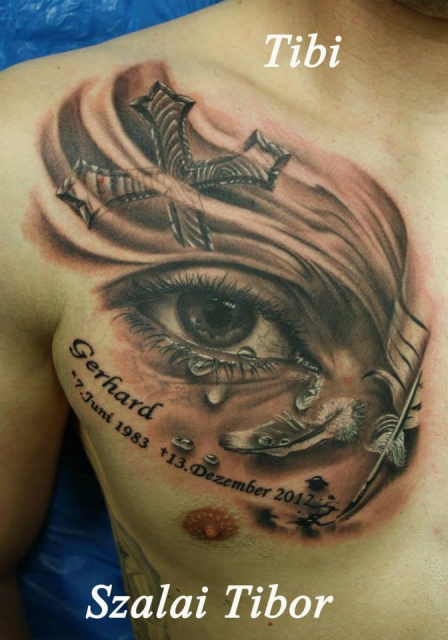 Zu dem Auge und den Tränen muss man ja wohl nicht viel sagen... einfach phantastisch. Die Idee mit der Schreibfeder und der Schrift ist gut, hätte das aber auch irgendwie anders zusammen mit dem Kreuz arrangiert.