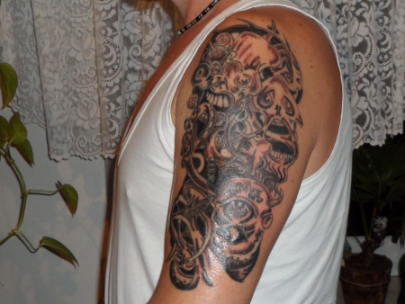 wie dancefloor schon geschrieben hat erkennt man leider recht wenig, was diesmal nicht nur am Abstand liegt. Das Motiv ist leider ziemlich überfrachtet mit Details, die so im Tattoo kaum funktionieren. DIe Schatten sind nicht gut gesetzt. zu den Linien kann man wenig sagen wegen des Abstands, aber auch da vermute ich keine gute Umsetzung. Problematisch wäre es, das noch aufzuarbeiten.