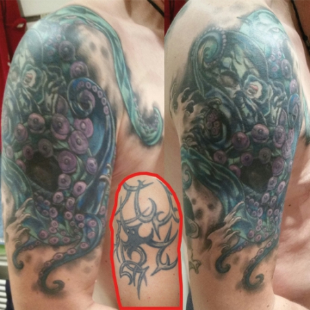 Das sich ein Oktopus in natura versteckt ist eine Sache, als Tattoo muss es sich aber nicht tarnen. Für mich geht die Lesbarkeit leider auch flöten, man erkennt sehr schwer um was es geht und aus der Distanz erst recht. Gut, die Altlast ist weg, sieht auch besser aus als vorher, doch optimal ausgeführt wurde es nicht in meinen Augen