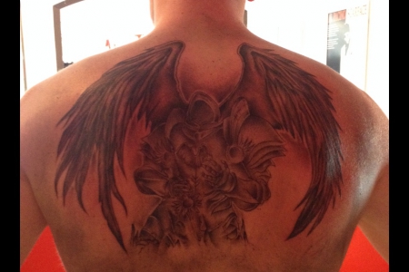 Insgesamt hat es 6 Stunden gedauert. Schmerzen hatte ich nur etwas beim schattieren auf der Wirbelsäule, die Flügel waren ziemlich entspannt.