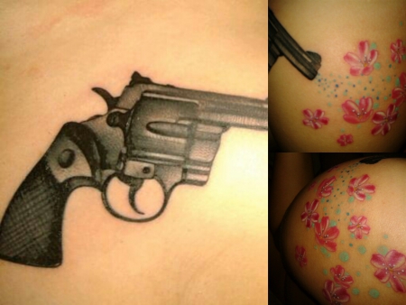Vermute mal es geht mit dem Revolver auf dem Dekoltee los, dann über die Schulter geschossen mit den Blümlein?