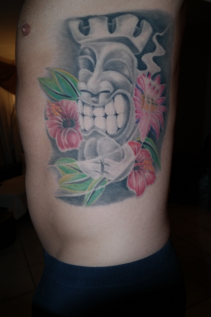 In den Blumen und Blätter fehlen mir schwarze Schattierungen, die für mehr Tiefe gesorgt hätten, die auch dem Tikki gut getan hätten. Bleibt aber für mich ein hübsches Tattoo, das anders ist und interessant wirkt.