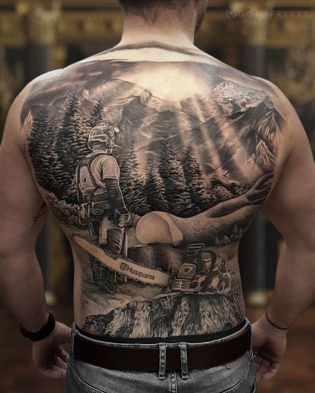 Hey, ich bin der Tätowierer dieser Arbeit. Der Träger is leidenschaftlicher Forstarbeiter wie man sieht😅