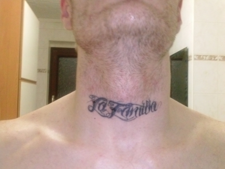 Kunden so wie dich habe ich immer õfter die dann zu einen kommen und sagen kannst was draus machen . ? Warum spart ihr immer an falschen ende ? . Jeder vernümftige tãttowierer hätte dir eine andere stelle angeboten oder die matritze anders gemacht . Ein tattoo sollte man sofort erkennen ohne den hals zu heben . Desweiteren hätte La Familia woanders 1000mal besser ausgesehen . Zumal ich fasst jeden 3.tag dieses wort im studio hõren muss . Nicht gut . Ist wie damals der arschtribal wahn . Leute überlegt mal in ruhe . Lg