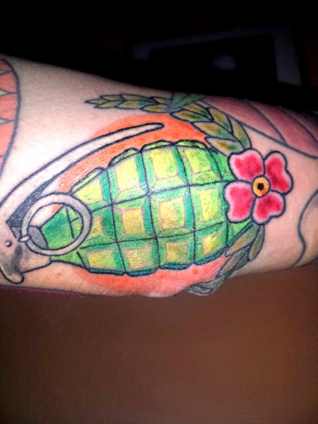 die Handgranate von der Form her eine Katastrophe, der orangene Hintergrund schlecht gemacht.