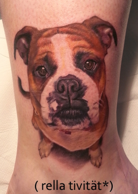 Auch wenn ich bekennender Hundetattoohasser bin, muss ich zugeben, dass dieses Exemplar schon sehr gelungen ist. Und das nicht nur handwerklich; auch den üblichen Punktabzug für den Mangel an Kreativität mag ich hier nicht vornehmen. Das Tier wurde aus einer eher ungewöhnlichen Perspektive fotografiert (aus "Herrchen-Perspektive", nah dran und mit Weitwinkel) und die daraus resultierende Verzerrung ist witzig und macht das Portrait tatsächlich individuell. Aber das passt auch zum letzten Hund
