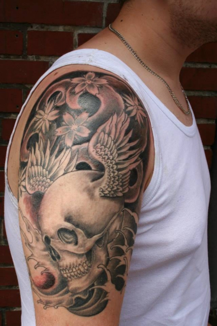 Hat so einen dezent kratzigen Touch. Den Skull finde ich nicht einmal schlecht, aber die Blüten und den Rest vom Hintergrund finde ich total daneben.Wie lange stichst du denn schon?