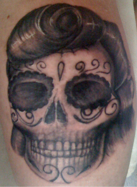 Das ist ein Schädel mit " Muerta" Aspekten und der Frisur meiner Schwester... War ein spontanes Tattoo auf der Convention Dortmund 2011.