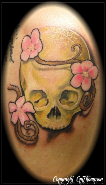 Nö is einfach nur n Schädel mit Blümchen. Nur die wenigsten meiner eigenen Tattoos ham ne Bedeutung und das is auch gut so. Ich hab ja auch nur wenige Pullis die ich anzieh damit ich ne Bedeutung nachempfinde. Will n Kunde ne Bedeutung kriegt er sie. Will er n schönes Tattoo kriegt er das.