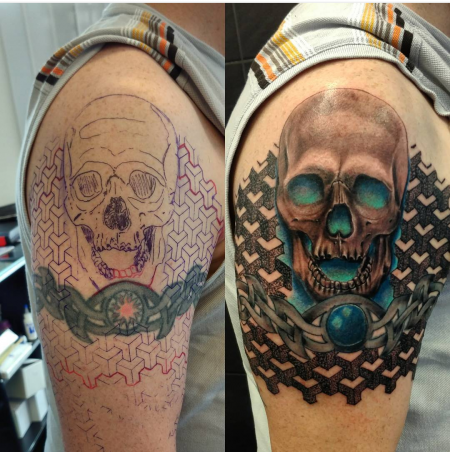 Ich bin kein Schädelexperte, darum mag ich nicht beurteilen, ob er anatomisch richtig dargestellt ist oder ob Brauen kleiner sein sollten. Mir gefällt gut, dass durch die grafischen Muster ein interessantes Motiv entstanden ist, was das Alt-Tattoo schick integriert ohne den Ansatz zu folgen, etwas zu verdecken.