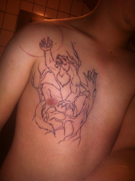 So, mein 2. Tattoo wurde gestern angefangen zu stechen ( nur mal die Outlines ) Es stellt einen Werwolf dar, der seine Kralle Richtung Mond ( Schulter ) ausstreckt, auf den Oberarm kommt noch ein Rabe