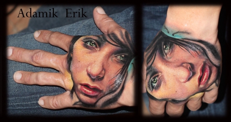Das Gesicht der Frau ist auf Grund der Haltung etwas verzerrt.