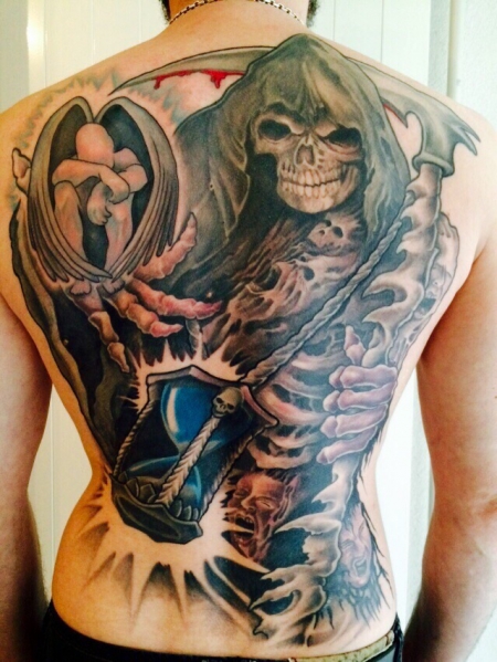 Der Engel links oben war ca. 25 Jahre allein auf meinem Rücken. Ziel war es ein Motiv zu finden in das er integriert werden kann. In zusammenarbeit mit meinem Tätowierer wurde dieses Motiv entworfen. Für mich stellt es die endlichkeit des Lebends dar., Scherzen waren teilweise echt übel (liegt aber glaub ich etwas an mir), Dauer ca. 20 Std. ( liegt auch etwas an mit). Ursprünglich wollte ich es komplett schwarz / weiss, was wir aber nach und nach verworfen haben. Das ist aktuell der Schlussstrich, aber die neuen Ideen kreisen schon in meinem Kopf;))
