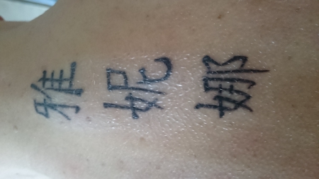 Mein Name in japanischen Schriftzeichen, Kosten ca. 150 €, Dauer 15 min, Schmerzen so gut wie gar nicht. Dies ist nach vielen Jahren das zweite Tattoo in einer Sitzung geworden. Wenn man erstmal wieder angefangen hat, kann man nicht mehr aufhören ;-)