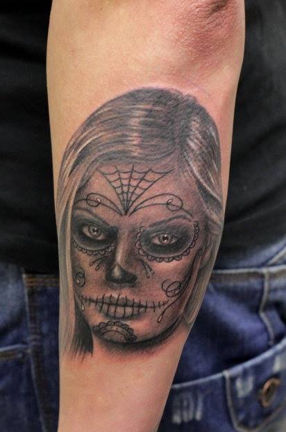 ! Am Oberarm ist schon ein Sugarskull, am Unterarm innen ein Lettering. Als nächstes kommt wahrscheinlich eine große Kerze.